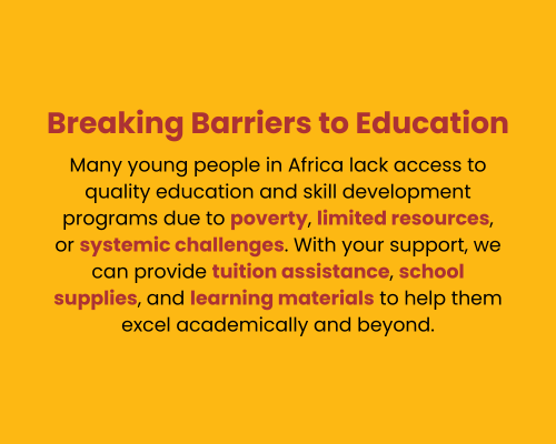 Your donation helps us provide education, mentorship, community outreach, and life-changing support to young Africans who need it most.